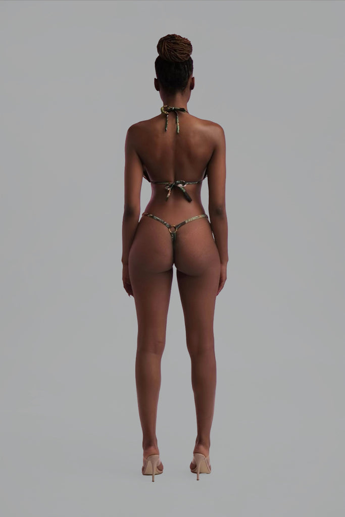 The Shila Bikini features a triangle top and thong-cut bottom adorned with rich green tropical leaves and gold chains. The top has a gold ring connecting the cups and ties at the neck and back for an adjustable fit. The bottoms feature a triangle-shaped front and thong back, with gold ring embellishments.
