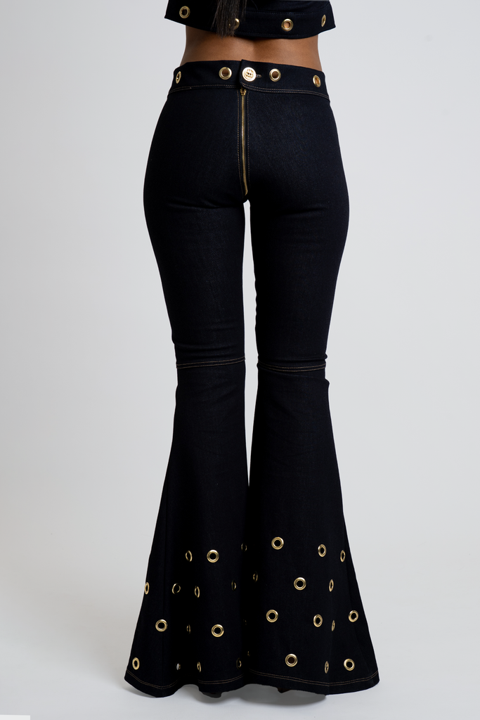 The Chance Denim Bell Bottoms feature dark denim with stitched knee detailing and a dramatic flared cut. Grommets line the waistband and cascade up the flare for a bold, edgy look.