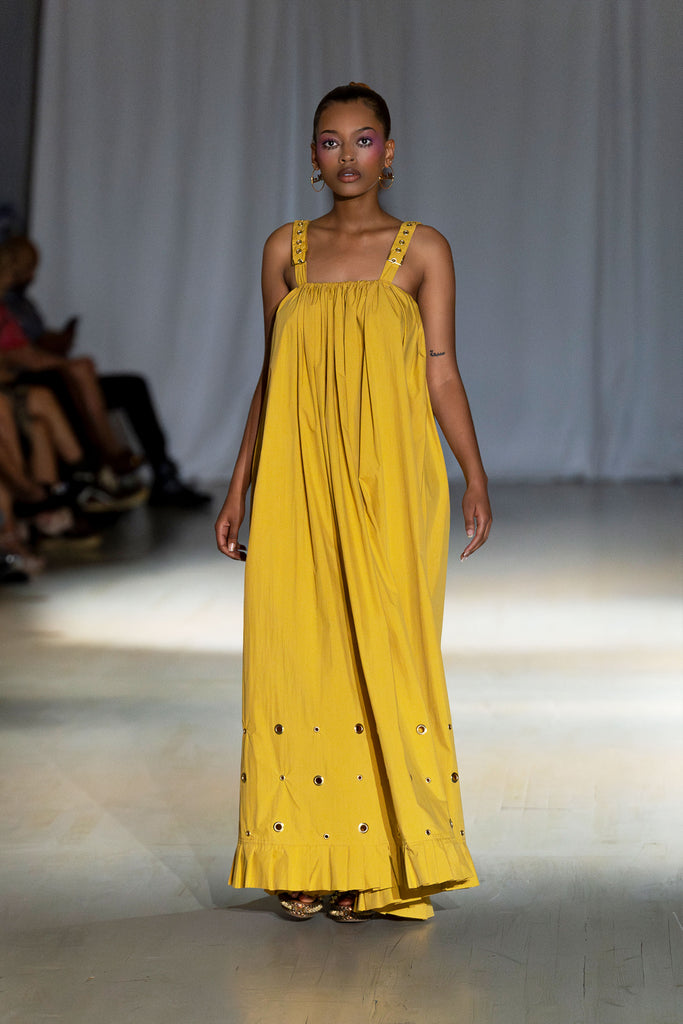 This mustard maxi dress explores shape through ease and precision. The silhouette is loose but intentional, with a gathered neckline that creates soft vertical folds from shoulder to hem. The straps are wide and structured, detailed with grommets that give a subtle nod to utility. Scattered eyelets across the skirt add texture and negative space, breaking up the surface without disrupting the flow. At the base, a clean pleated hem introduces movement and weight, holding the volume in place. The piece lives between function and softness, structured but unforced, modern but grounded.