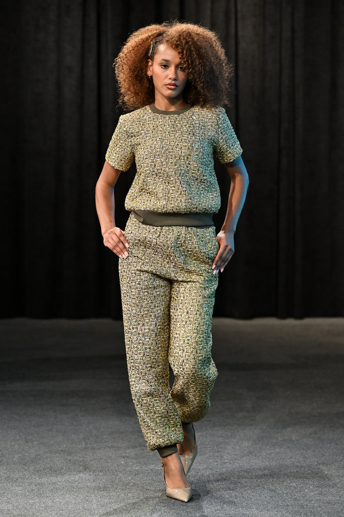 The Women's GreenStar Pants brings radiant sparkle to everyday luxury. Designed in a rich greenish gold and iridescent sequin tweed, this set blends comfort with high impact shine. Woven with shimmering metallic yarns, holographic accents, and scattered gold sequins, the fabric catches light from every angle, giving the entire look a glowing halo effect. These pants are designed with a comfortable elastic waistband and an adjustable drawstring for a customizable fit. The silhouette is easy, flattering, and perfect for styling up or down depending on the moment.