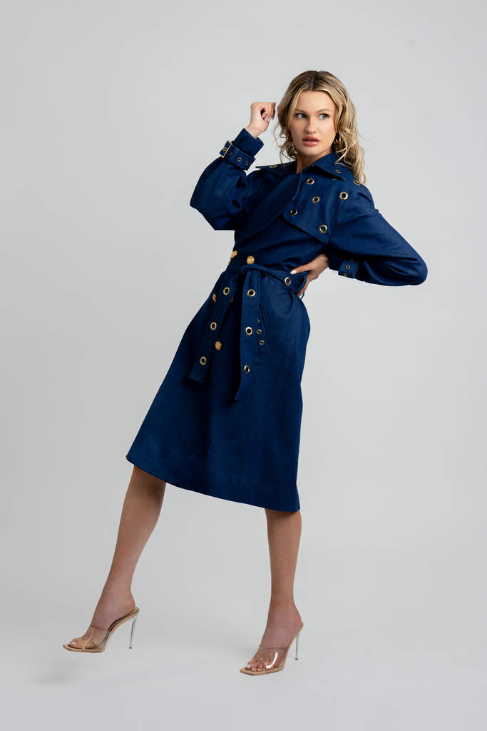 The Bellina Denim Trench Coat features blue denim with a satin lining for comfort. Gold flake buttons and brass grommets accent the cuffs, hem, and neckline. Adjustable cuffs and a cinch belt offer a tailored fit, while the storm flap and deep pockets add functionality.