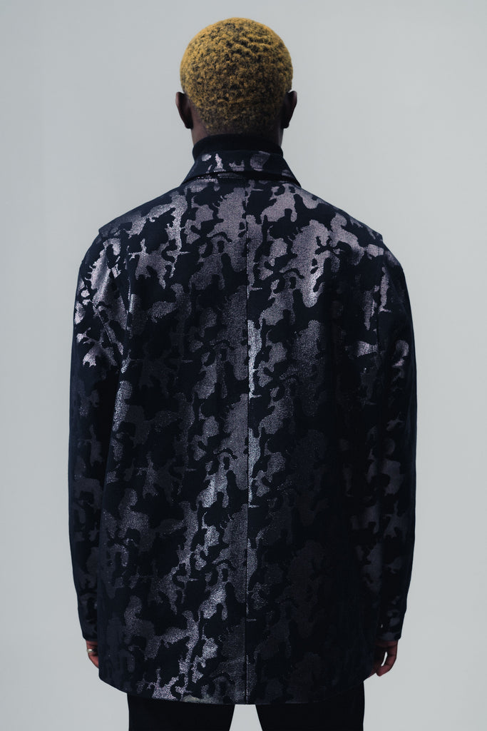 The Darrio Utility Jacket features metallic black camouflage denim in an oversized fit. This heavy-duty jacket blends functionality with a distinctive, reflective style. It includes five minimalist silver buttons, front flap pockets, and satin lining for added comfort.