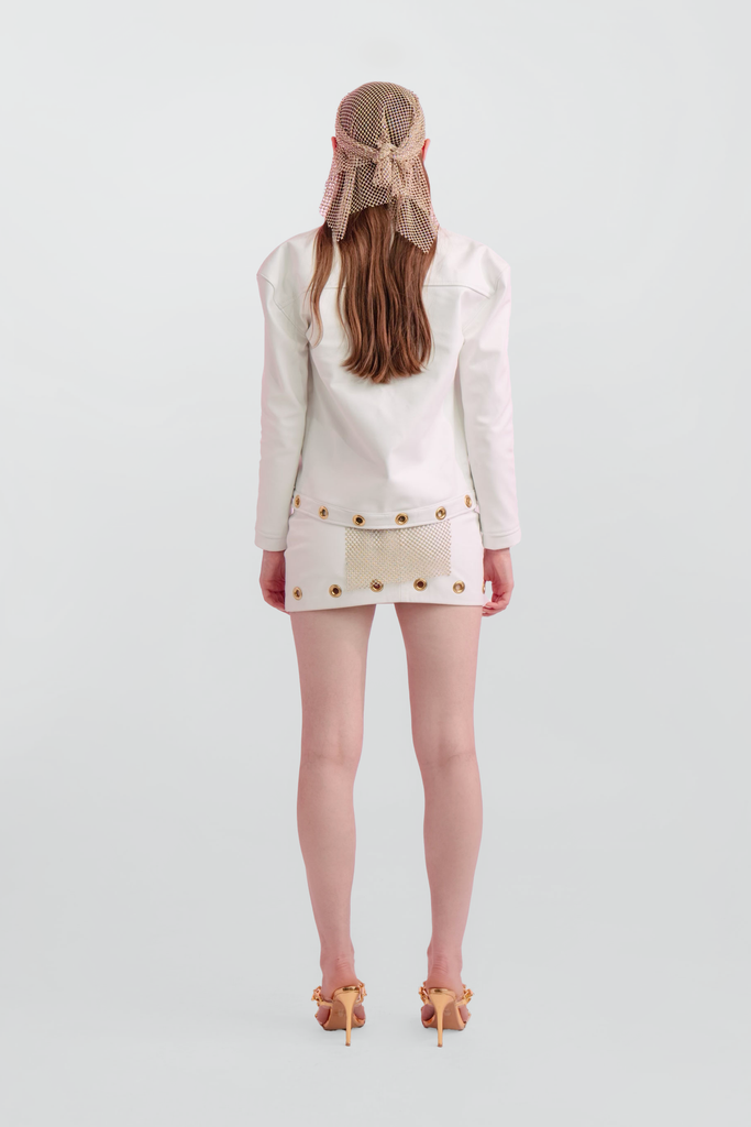 Crafted from striking white leather, the Juliana Leather Jacket features snap closures and gold grommets for added flair.