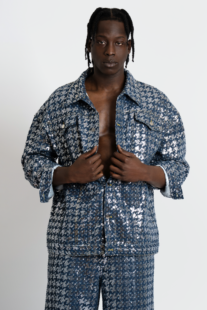 The Bleu Sequin Denim Jacket is where the classic denim jacket meets high-fashion brilliance. This statement piece reimagines traditional denim with a full sequin overlay, creating a dazzling interplay of light and texture. Featuring a relaxed silhouette, structured collar, and signature contrast stitching, it merges casual ease with runway glamour. Designed for those who refuse to blend in, this jacket is the ultimate power move, whether paired with our matching sequin denim shorts or styled as a bold standalone piece.