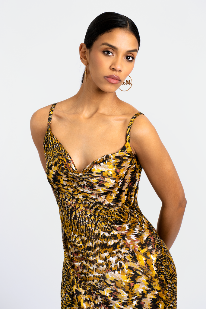 Designed with a bias-cut silhouette that skims the body, this luxurious fabric drapes naturally, enhancing movement with every step. A soft cowl neckline adds a touch of refinement, while delicate spaghetti straps frame the shoulders for a barely-there allure. The print is an electrifying fusion of gold, black, and earthy tones, evoking the raw beauty of the wilderness, transforming classic slip dress minimalism into a bold statement.