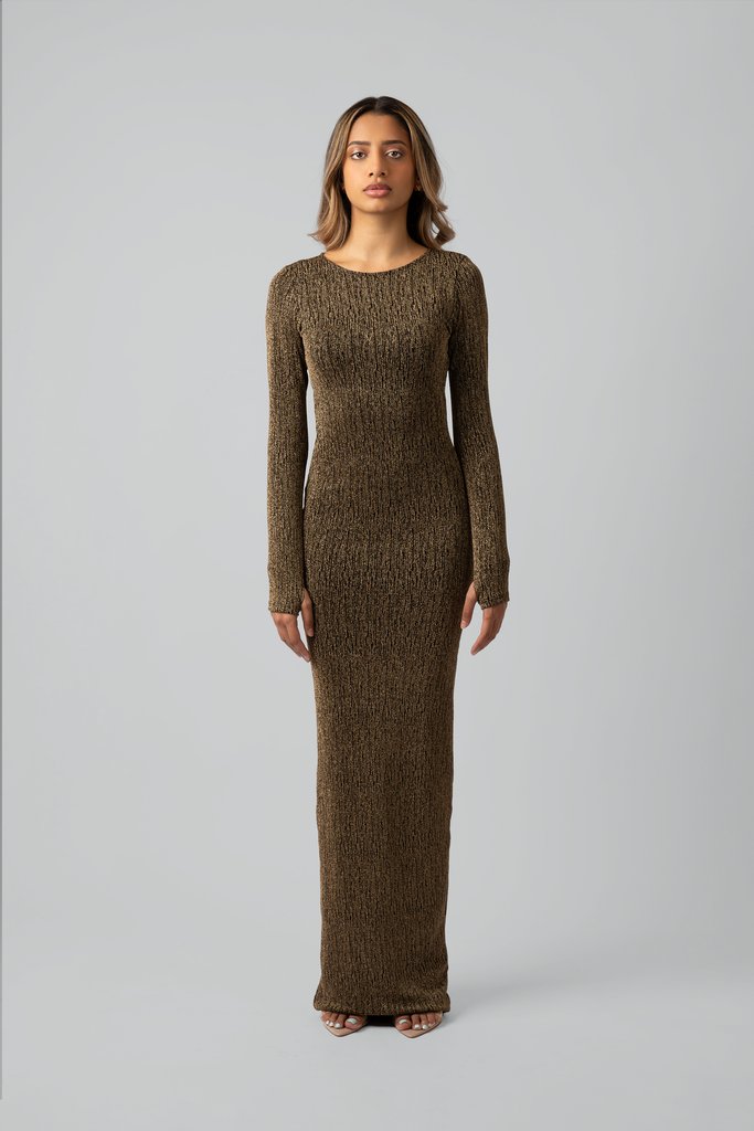 The Monarch Dress seamlessly combines chic style and comfort. Its floor-length silhouette is crafted from striking stretch fabric, featuring a textured shimmer fabric. The unique thumb cut-out sleeves add flair while keeping your wrists warm during colder months.