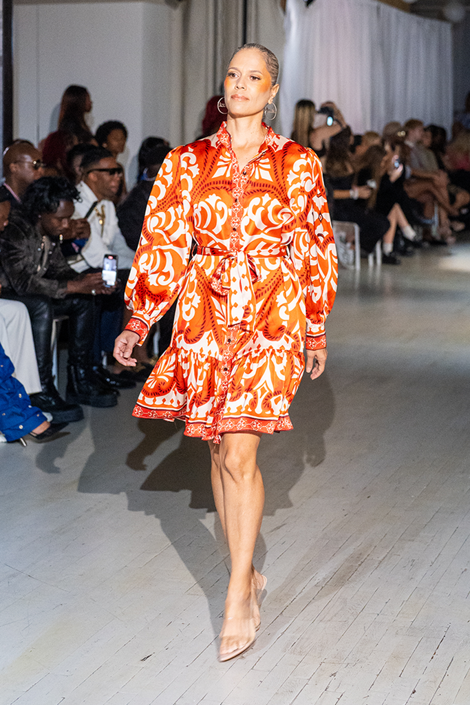 Featuring a striking orange-and-cream baroque-inspired print, this dress is designed with voluminous sleeves, a cinched waist, and a flowing tiered skirt for the perfect balance of structure and movement. The classic button-down silhouette is elevated with intricate detailing, making it a statement piece for any occasion.