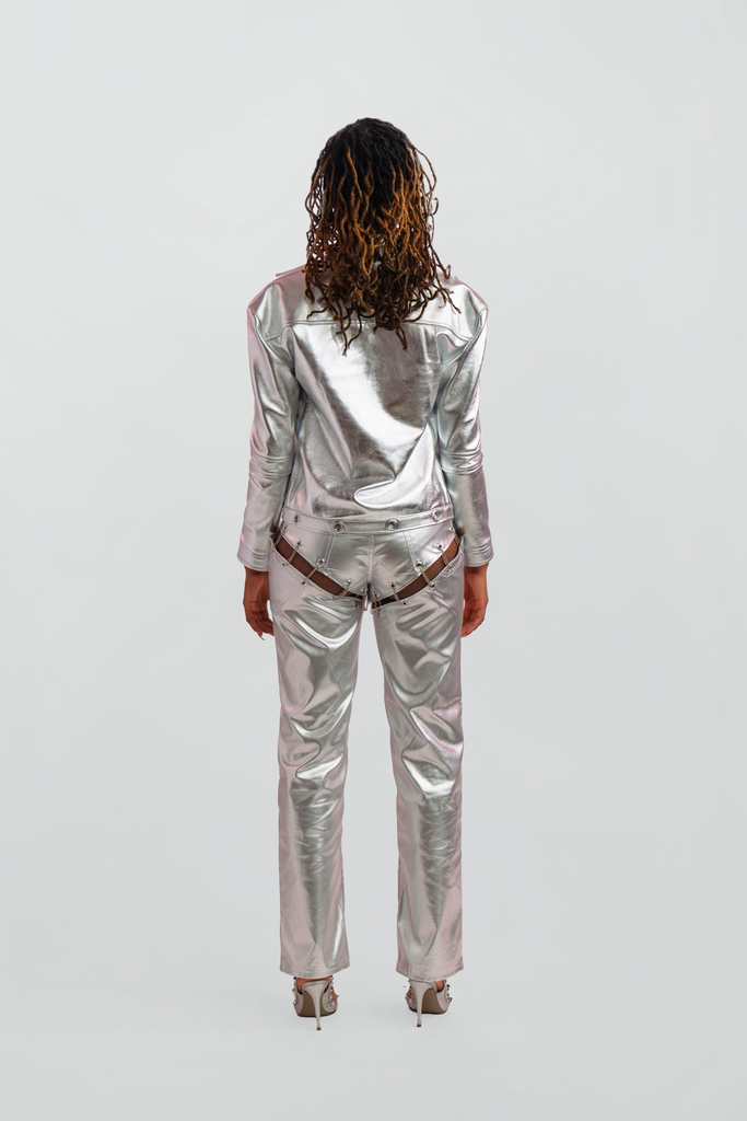 The Ariana Cut Out Pants feature striking silver grommets and looped chains that enhance their edgy design. Crafted from breathable and smooth fabric, they ensure comfort and a polished look. With cutouts for added flair and utility pockets for convenience, these pants blend style with functionality.