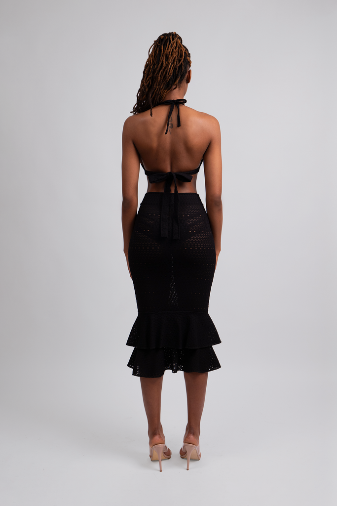 The Cassandra Set features a black cotton lace knit with a see-through, triangle bralette and a high-rise, midi-length skirt. The bralette has a halter neck and tie back, while the skirt is detailed with double-layered ruffles for a stylish touch. This stunning look can easily be dressed up or down.