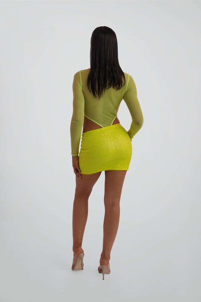 Add a pop of neon to your wardrobe with the Quinn Sequin Skirt! This vibrant chartreuse mini skirt features fun sequin detailing and a comfortable step-in stretch design, eliminating the need for a zipper. Pair it effortlessly with the Sherry Sheer Bodysuit for a perfectly coordinated ensemble.
