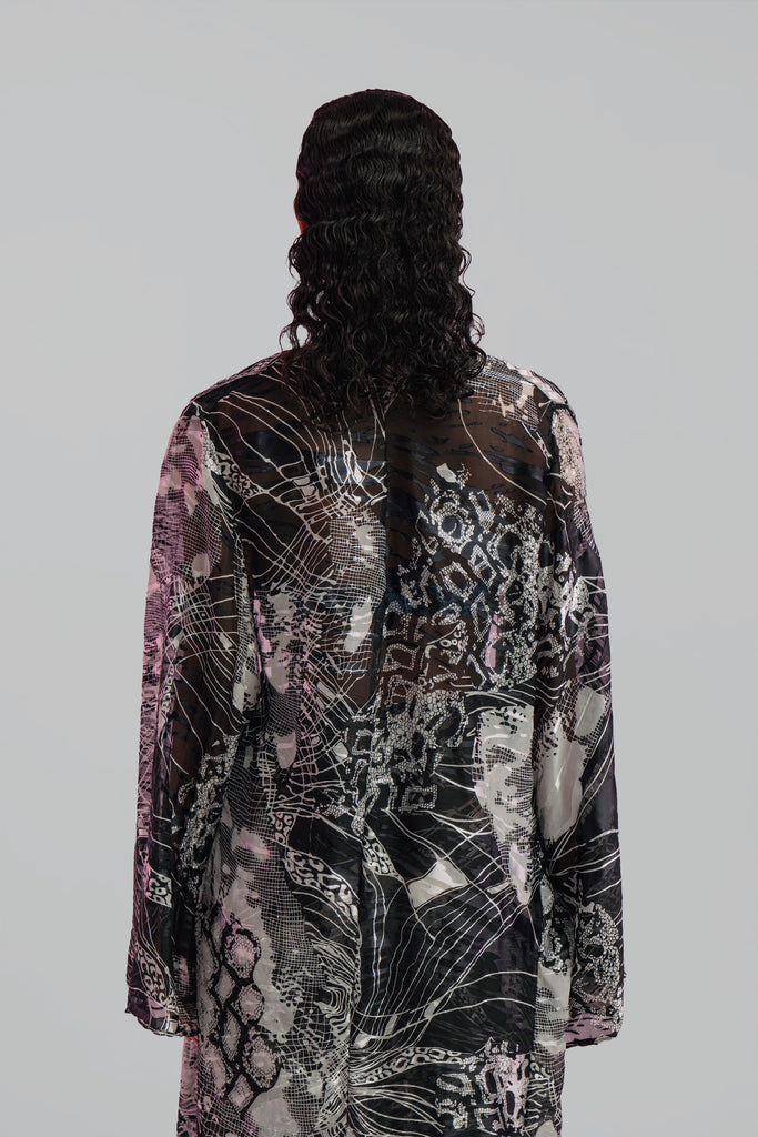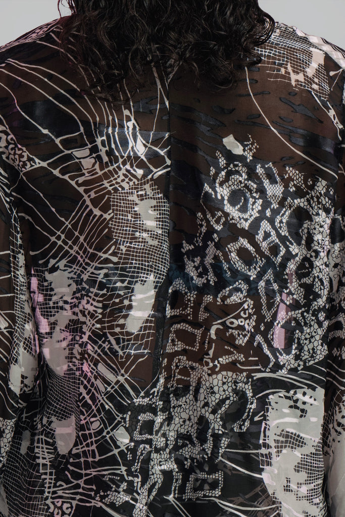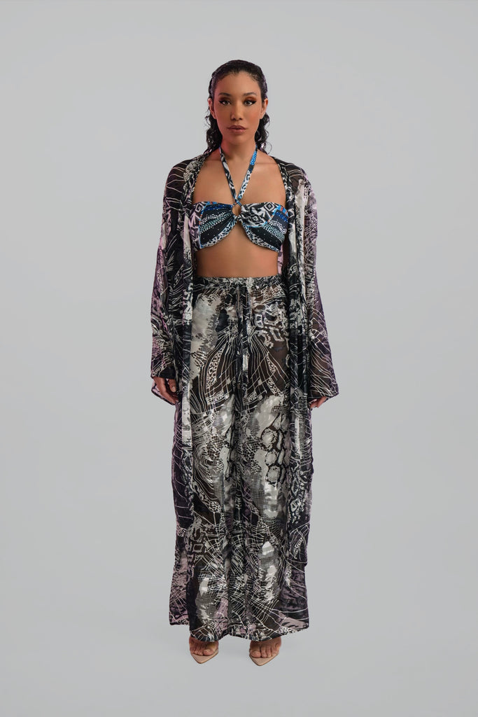 Upgrade your beach look with the Sina Silk Cover Up featuring an intricate black and white graphic print. This coverup top is designed with an open-front style and falls below knee-length for a flowy effect.